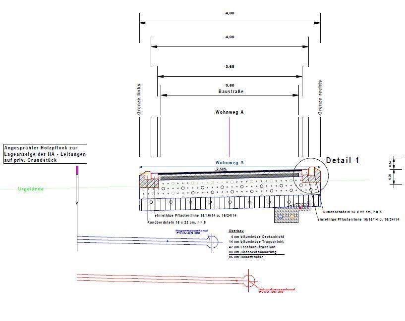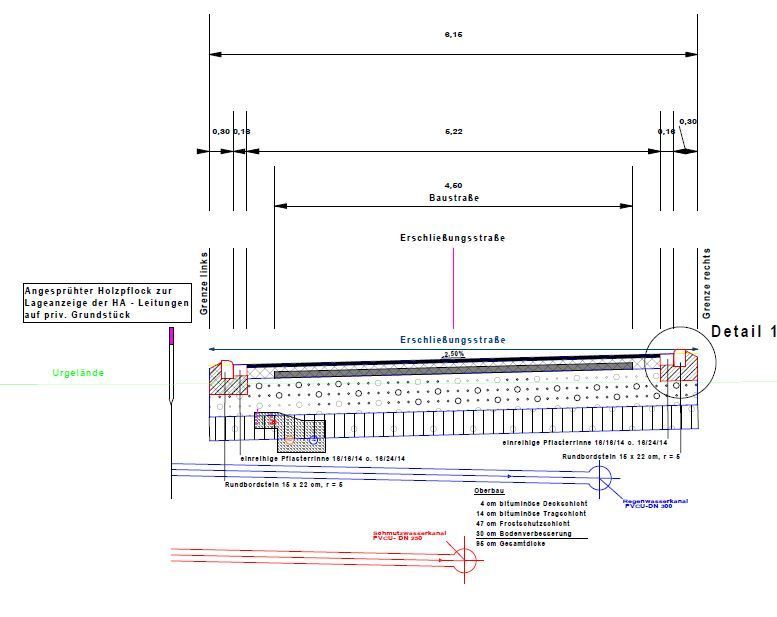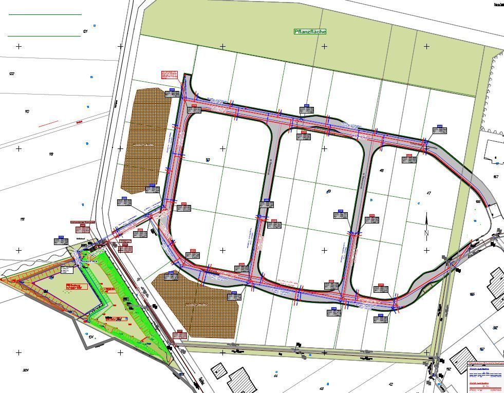 Komplette Planungs- und Bauleistungen für die abwassertechnische und verkehrliche Erschließung inkl. Vermessungsleistungen.