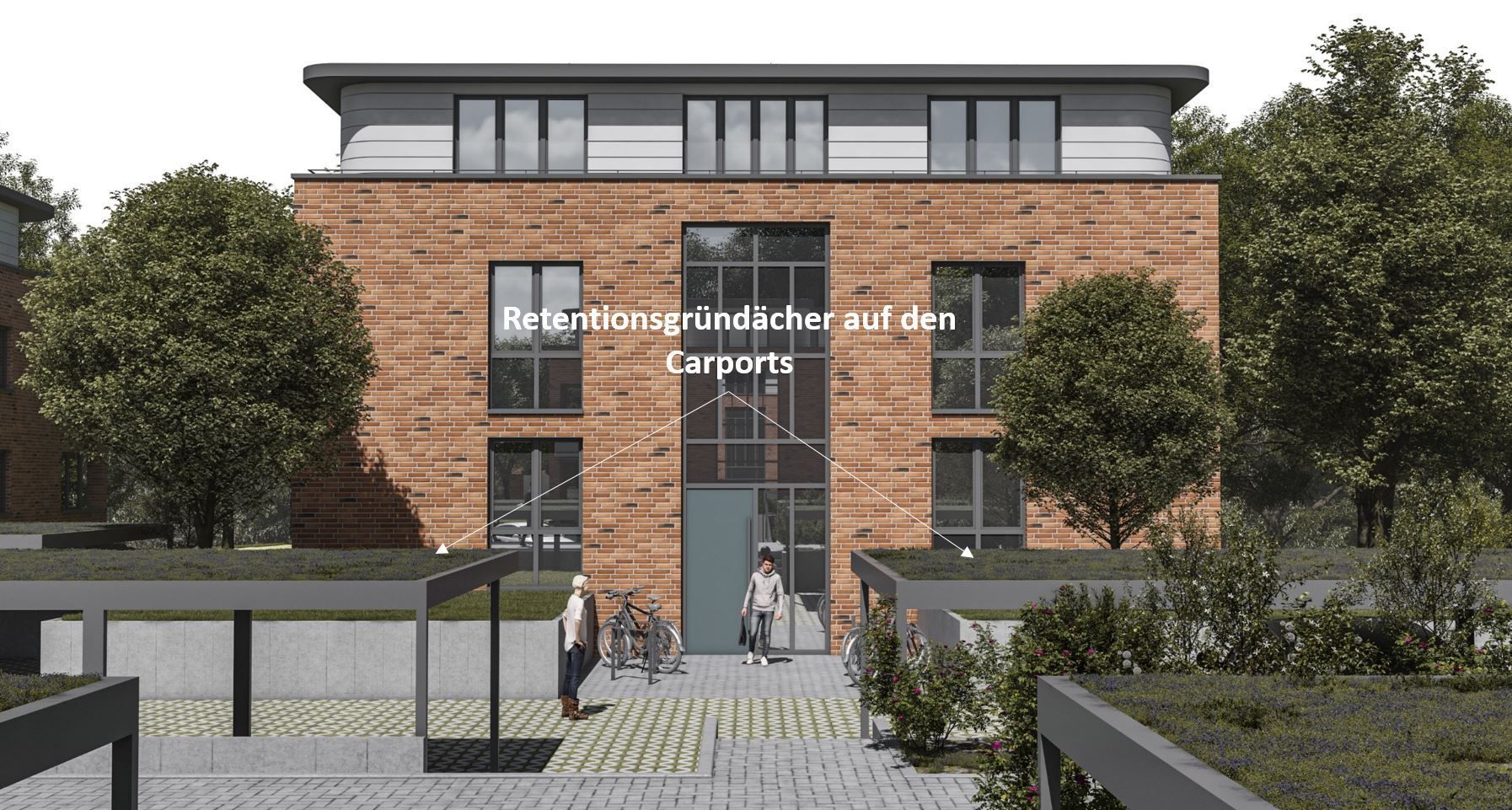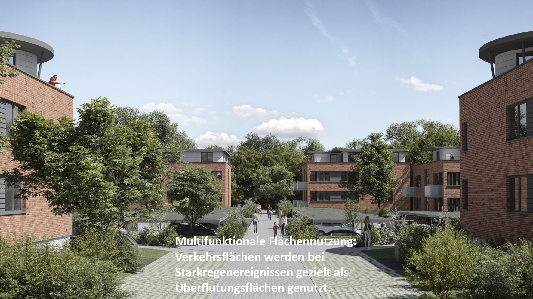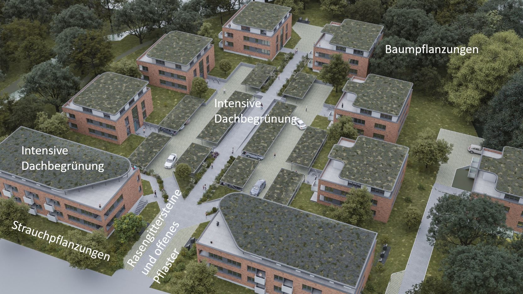 Bei diesem Projekt war eine Fläche von rund 1,4 ha, welche sich ursprünglich als naturbelassene Grünfläche darstellte, zum Zwecke der Wohnbebauung zu erschließen. Das Plangebiet grenzt im Norden an ein natürliches Stillgewässer und wird im Westen durch einen Vorfluter begrenzt. Auf dem Plangebiet entstehen 9 Mehrfamilienhäuser mit insgesamt 61 Wohneinheiten. Während das Schmutzwasser über einen öffentlichen Kanal entwässert wird, war für das Regenwasser ein umfassendes Konzept unter Bewertung des lokalen Wasserhaushalts zu erarbeiten. Hierzu wurde konsequent das Konzept der Schwammstadt umgesetzt. Dank intensiver Dachbegrünung, offenporigen Verkehrsflächen, multifunktionalen Flächennutzungen, intensive Bepflanzung im Gebiet und oberflächlichem Abfluss der Niederschlagswässer konnten mittels NA-Langzeitsimulation eine Resilienz des Gebietes für 100-jährliche Niederschläge nachgewiesen werden. Die Abweichungen des lokalen Wasserhaushalts durch die Bebauung (Urbanisierung) konnten durch die v. g. Maßnahmen für die Komponenten „Abfluss, Versickerung und Verdunstung“ auf unter 5 % des Referenzzustandes gebracht werden. Durch das Planungskonzept ist ein Gebiet mit sehr hoher Lebensqualität (Verdunstungskühle und Beschattung im Sommer) sowie sehr hoher Klimaresilienz in Bezug auf Starkniederschläge und Überflutungsschutz entwickelt worden.