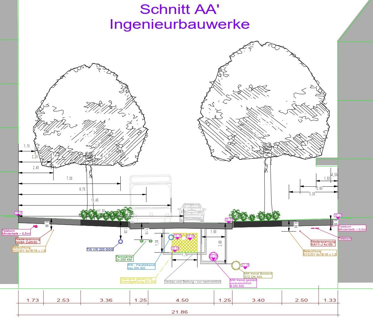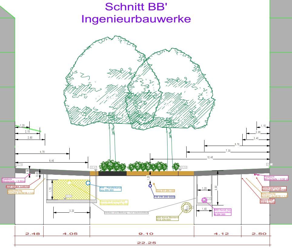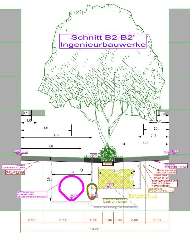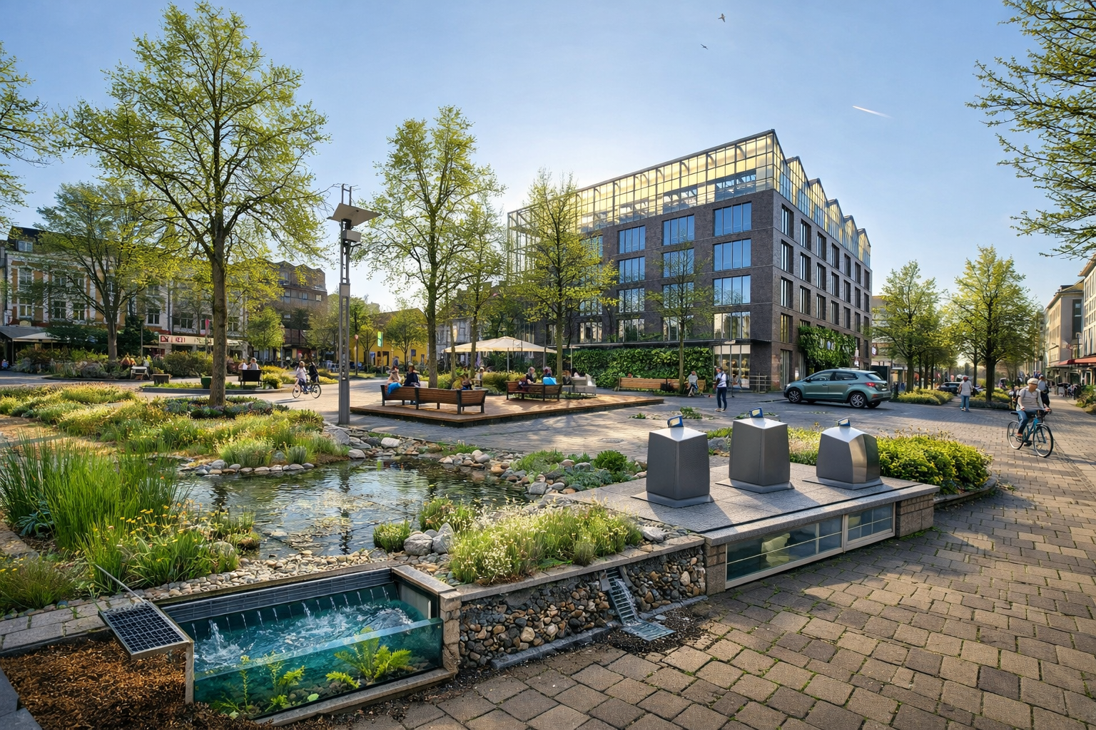 Für den Umbau einer innerstädtischen Fußgängerzone wurde ein integrales Konzept aus Entsiegelung, Begrünung und dezentraler Regenwasserbewirtschaftung erarbeitet. Die drei Planungsabschnitte umfassen zusammen rund 31.120 m² Gesamtfläche; davon sind im Bestand ca. 30.381 m² versiegelt. Perspektivisch werden durch neue teil-/vollversickerungsfähige Beläge und Grünflächen insgesamt ca. 5.470 m² in un- bzw. teilversiegelte Oberflächen überführt (je nach Abschnitt bis etwa 30 %). Gleichzeitig wächst die Zahl der Bäume im Straßenraum deutlich: von 84 Bestandsbäumen auf 163 Standorte (zusätzlich 79 neue Baumstandorte). Das Niederschlagswasser wird getrennt gesammelt, vorgereinigt sowie in Rigolen zwischengespeichert und versickert; in einem Abschnitt sind hierfür u. a. ca. 410 m Rigolen mit rund 593 m³ Speichervolumen vorgesehen. Die Nähe zu den Baumstandorten ermöglicht optional eine Bewässerung mit gereinigtem Regenwasser.