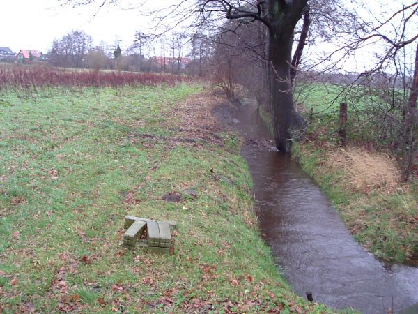 symmetrischem, nahezu trapezförmigem Querschnitt. Sehr gutes Platzangebot zur Ausgestaltung des neuen Gewässerprofils und der Vorländer.