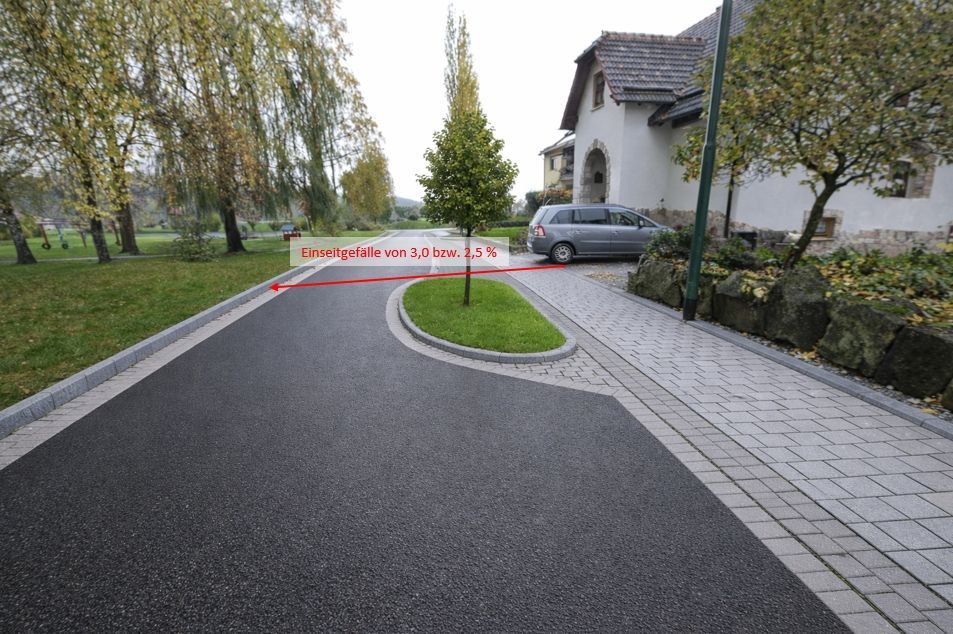 Im Rahmen der Planung wurde der Endausbau einer innerörtlichen Erschließungsstraße verbindlich festgelegt. Der Querschnitt basiert auf einem durchgängigen Einseitgefälle zur Entwässerungsseite: Die Fahrbahn wird in Asphalt ausgeführt, der Gehweg in Betonpflaster. Zur klaren Raumkante kommen durchgehend Rundborde (R5, 15 cm) zum Einsatz; zum Privatgrundstück erfolgt der Abschluss mit Tiefbord. Die Oberflächenentwässerung wird über eine durchgehende Rinne mit Straßenabläufen organisiert; Schächte und Einbauten werden höhenverträglich in die Gradiente integriert.