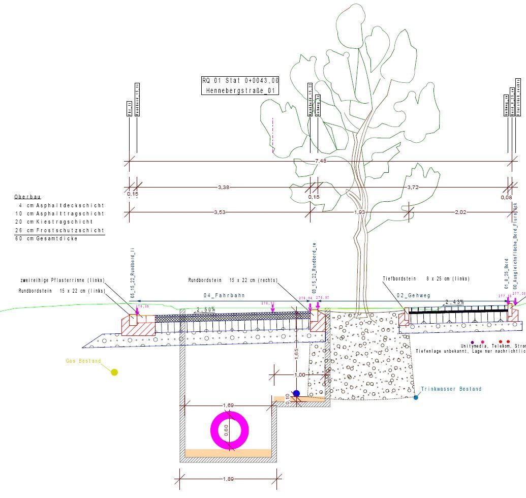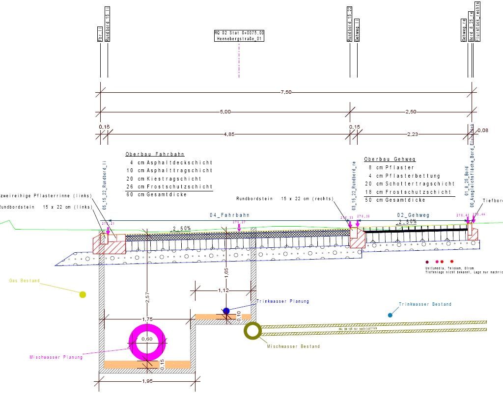 Besondere Randbedingungen – wie zahlreiche Grundstückszufahrten, Stufenanlagen sowie ein vorhandener Durchlass – wurden in der Höhenplanung berücksichtigt, um einen sauberen Anschluss an den Bestand zu gewährleisten. Ergänzend sind Straßenbegleitgrün und Baumstandorte vorgesehen; die Bäume werden in FLL-konformen Baumgruben geplant und mit Leitungen abgestimmt. Unterirdische Infrastruktur (Kanal, Trinkwasser) wird als maßgebliche Planungsrandbedingung mitgeführt und in separaten Fachplanungen weiter ausgearbeitet.