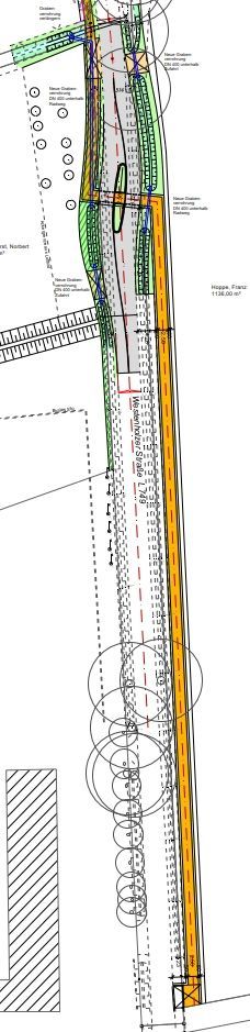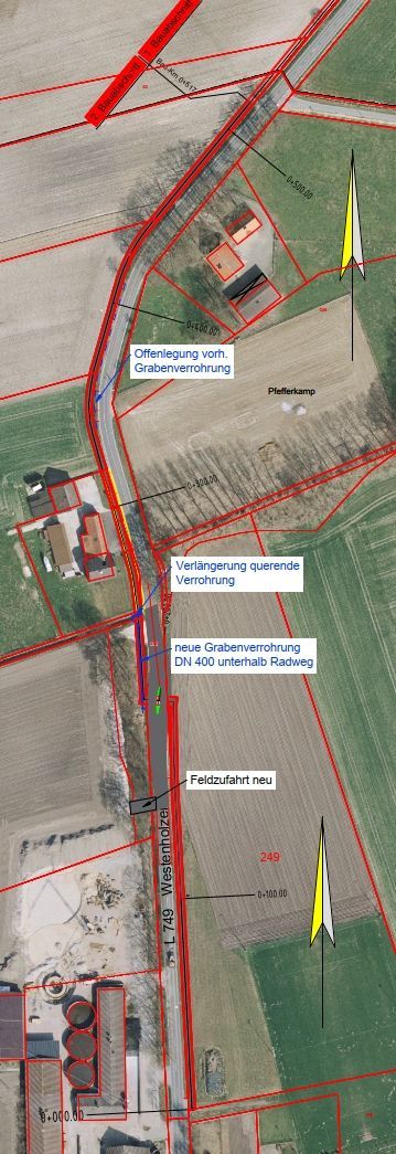 Bei der weiteren Bearbeitung standen zwei technische Schwerpunkte im Vordergrund: die Planung einer Verkehrsinsel als Querungshilfe zur sicheren Kreuzung des Radweges mit der Fahrbahn sowie die Anpassung der Entwässerungsanlagen im Bereich der Straßengräben (Neubau, Verlängerung und Offenlegung von Verrohrungen). Als Planungsgrundlagen lagen u. a. Lage- und Maßnahmenpläne mit Bestandshöhen und Luftbild vor; ein Baugrundgutachten befand sich in Bearbeitung.