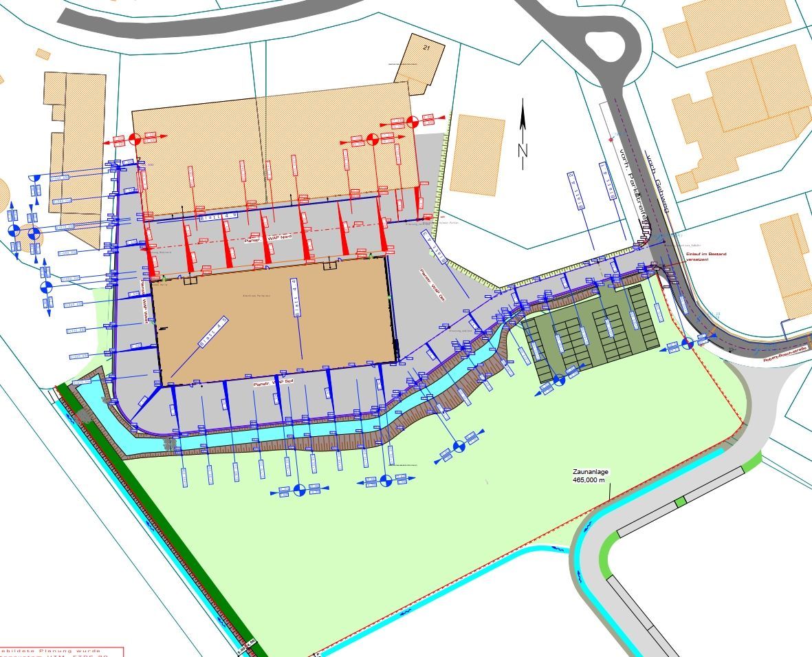 Beschreibung: Für ein Gewerbestandort wurde ein integrales Konzept für Entwässerung, Genehmigung und Erschließung erarbeitet. Schmutzwasser wird über neue Grundleitungen mit Revisionsschächten an den öffentlichen Kanal......