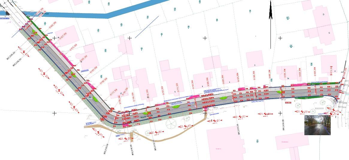 Beschreibung: Im Rahmen der Planung wurde der Endausbau einer innerörtlichen Erschließungsstraße verbindlich festgelegt. Der Querschnitt basiert auf einem durchgängigen Einseitgefälle zur Entwässerungsseite: Die Fahrbahn wird in......